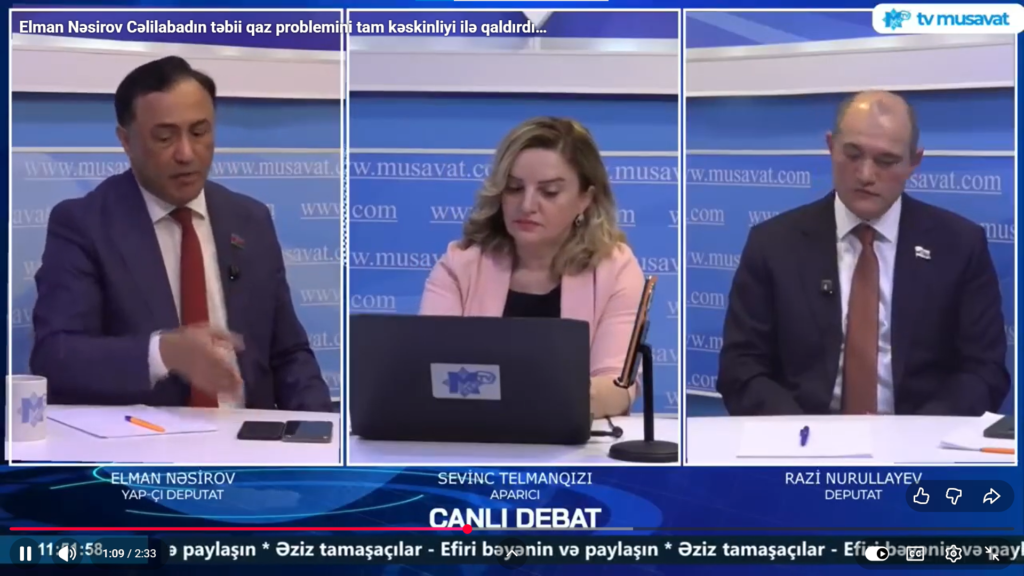 Musavat TV-nin YouTube platformasında yayımlanan canlı debat zamanı millət vəkilləri Elman Nəsirov və Razi Nurullayev arasında müzakirələr aparılıb.